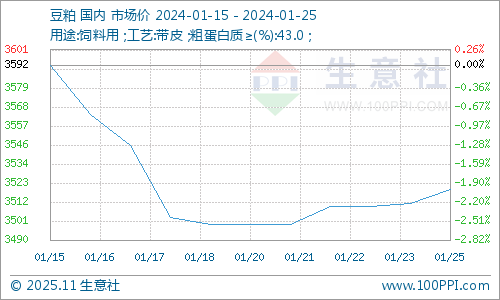 据生意社商品行情分析系统显示:1月中旬以后,利空因素出尽,国内豆粕行情跌势放缓,行情迎来反弹,价格跌至3520元/吨左右,跌幅2%。1月15日,豆粕市场均价3592元/吨,1月25日,豆粕市场均价3520元/吨,价格下跌2%。