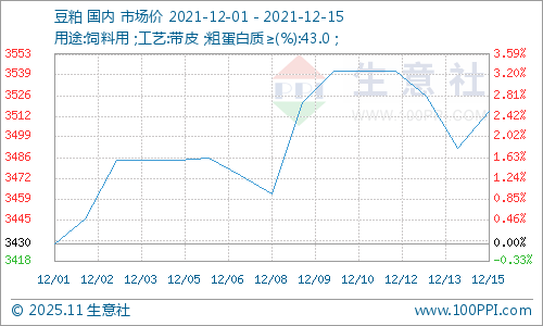 据生意社数据监测显示:12月1日以来,国内豆粕行情振荡上涨,行情整体回暖。月初,豆粕市场均价3430元/吨,20日,豆粕市场均价3502元/吨,价格整体上涨2.1%。